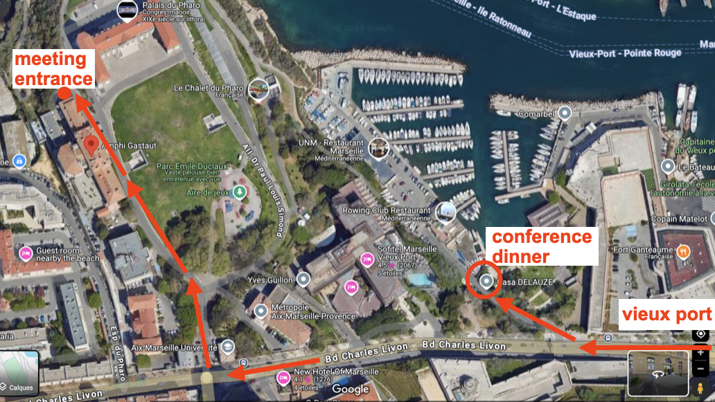For those wishing to come to the "Laboratoire d'Astrophysique de Marseille" (LAM) for the working groups on the last day (May 23, 2025), you can easily get there from downtown by taking the M1 metro line in direction to "La Rose". Go all the way to the last stop (i.e. "La Rose"), then, downstairs, turn right, go to the other side of the bus lane to take the B3B bus in direction to "Technopôle de Château-Gombert", and get down at the Technopôle Centrale Marseille bus stop. A new bus arrives every 15 min or so and you can use the same ticket as in the metro to validate the transfer. Alternatively, you can also walk from the metro terminus to LAM and back, though we do not recommend to walk alone passed nightfall.